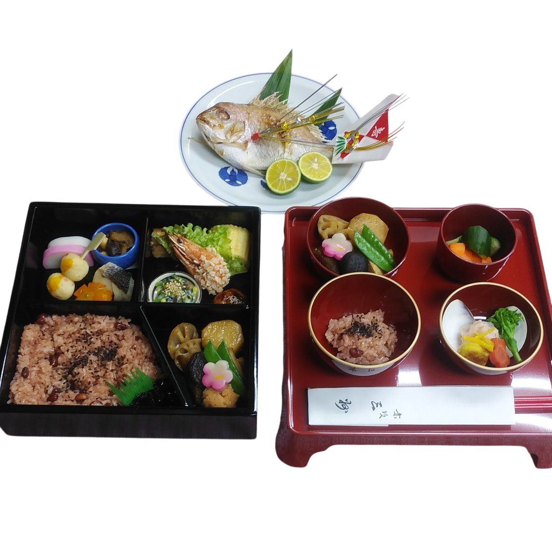 お赤飯にお吸い物(一汁)、鯛塩焼き、煮物、香の物(三菜)です。
